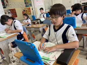同じキャンパスに幼稚園から大学院までの幅広い年齢の学生が通っています。学生の交流はもちろん、教育施設や人材の共有も魅力の一つとなっています。本校ではこれからの時代を見据え、ICT教育環境を整備し、文部科学省デジタル教科書推進校として最先端の授業を展開しています。授業では児童一人につき一台、タブレット端末を使用できます。県内初となる新たな試みとして、オンラインによるマンツーマン英会話授業を実施しています。